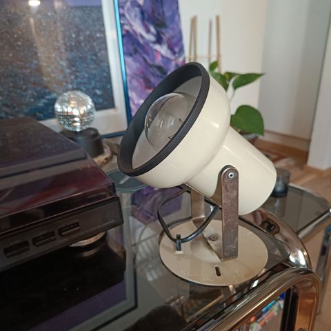 Luultavasti Livalin valmistama valaisin, jossa maadoitettu töpseli, toimivaksi testattu. Jonkin verran ajan patinaa jalustassa ja kuvussa. Vain nouto.