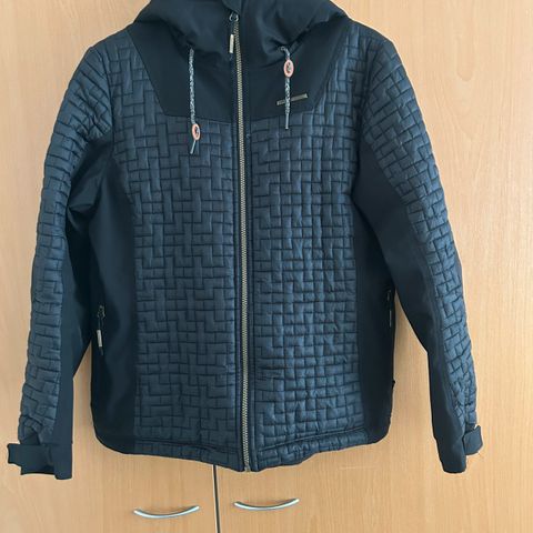 Naisten musta Impuls takki vuorella, koko 44. Kainalo-kainalo 58cm, olka-helma 90cm.