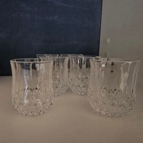 6 kappaletta snapsilaseja. Korkeus 9 cm ja halkaisija 5 cm. Vetoisuus 0.5 dl. Virheettömät.