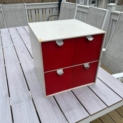 Mitat 34,5 x 34,5 sisältäen 4 ulosvedettävää laatikkoa joista ylemmät makaavat välihyllyn päällä.