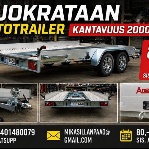 Temared traileri vuokrattavana, kantavuus 2000kg, kokonaispaino 2700kg.