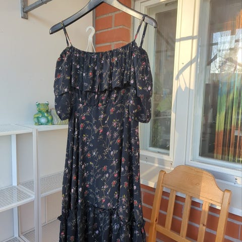 Kaunis sininen kesämekko, jonka ”olkaimet” saa pidettyä joko olkapäiden päällä tai sivuilla. Kevyttä materiaalia.