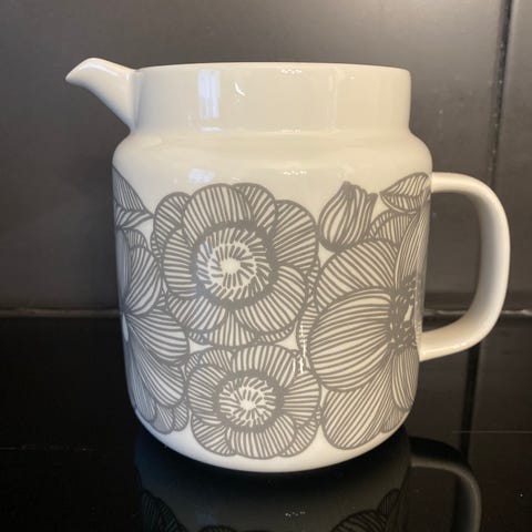 Myydään hyväkuntoinen, muutamia kertoja käytetty Marimekko Oiva harmaa Kurjenpolvi kannu, 1,25 L.