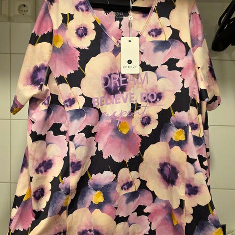 Kaunis Zhenzi kukkapusero. Pohjaväri luonnonvalkoinen, jossa kukkakuviointi mustalla ja viininpunaisella. Puserossa on kaunis rypytetty etuosa pyöreässä pääntiessä. Nappi kiinnitys takana. Hihansuissa kuminauha. A-linjainen. Mukana varanappi.