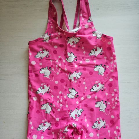 Käyetty kaksiosainen muumi uimapuku: housut, paita ja lakki. Muumit kuluneet pois ja hatun lippa käyristynyt, mutta edelleen ehjät
