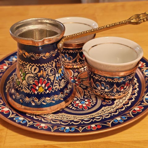 Käyttätn kahvikalusto Turkin matkalta. Ollut koristeena, ei käytössä. Kuvien mukainen. Nouto ja käteismaksu noudettaessa tai lähetyskulut 12euroa.