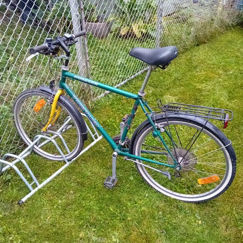 Miesten polkupyörä, Vaihteet toimii, vanteet suorat 7 vaihdetta, matkamittari, pumppu.