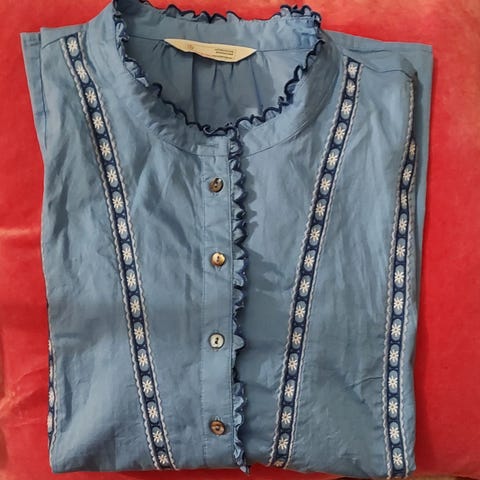 Hempeä maalaisromanttinen puuvillainen paita pitsillä yms. Koristuksilla. Piilovetoketju sivusaumassa helpottamassa pukeutumista. Kainalo-kainalo mitta 48cm. Ärräp. 5.90e