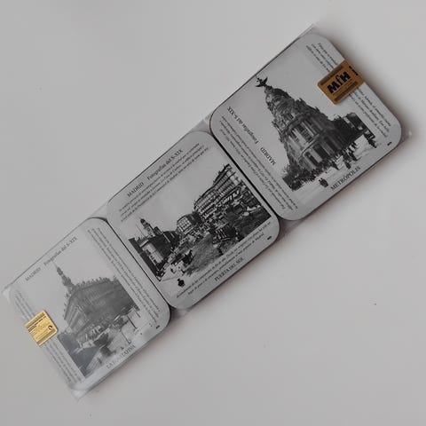 Kuusi rottinkista Tenerife saarikartta-lasinalusta omassa, kahdella aisalla suljettavassa säilytystelineessä. Lasinalusen halkaisija: 8,5 cm.
