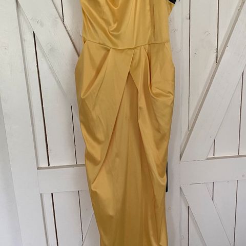Myydään kauniin keltainen Canadassa valmistettu juhlamekko, johon kuuluu sifonki huivi.