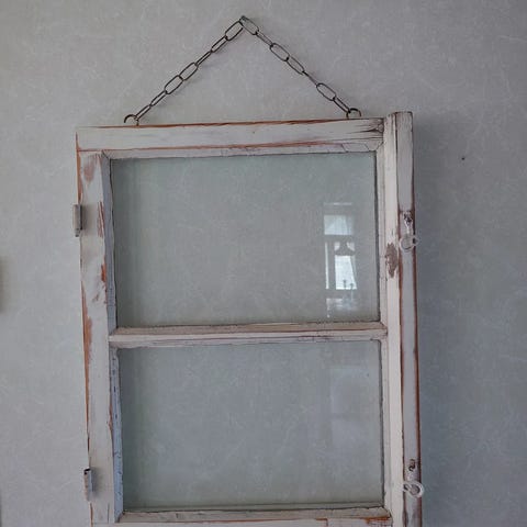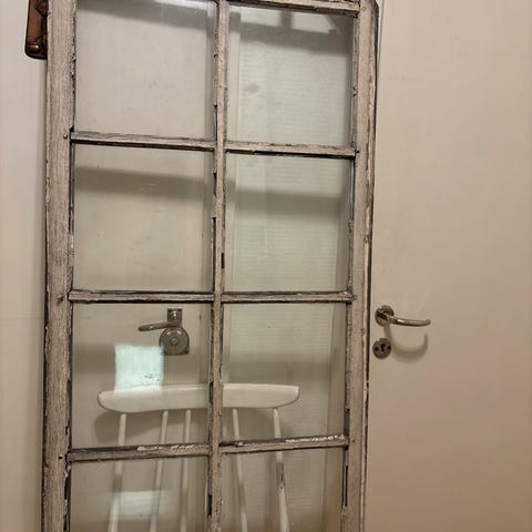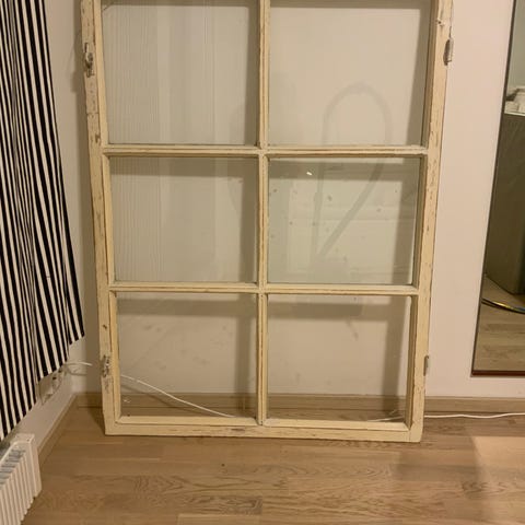 Kaunis maalaisromanttinen vanha ikkuna. Voi ripustaa seinälle. Koko noin 1 m X 40 cm.