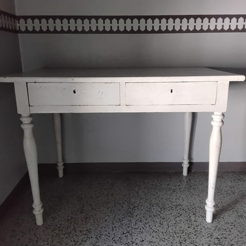 Erikoinen ja iäkäs kokonaisuus, todella vanhasta aitan ovesta (lankkujen paksuus 4cm) tehty pöytä jossa vielä vanhempi tukeva jalkaosa. Sepän takomat oven saranat antavat mukavan lisän ja silmänilon tasolle. Ikä ja patina hienosti esillä.
