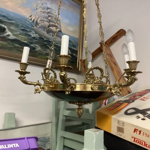 Hienokuntoinen Vanha kattovalaisin, runko pronssia, halkaisija 45cm,korkeus 70cm. Tämä on Vanha Sievä valaisin.