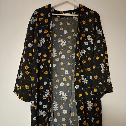 Kerran kuvauksissa päällä ollut,joten on kuin uusi. Vetoketju takana melkein helmaan saakka. Kai-kai n41-42 kun hieman joustaa Olka-helma 57. Jos postit lisötään ne hintaan