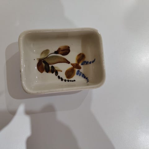 Käsinmaalattu kulho rottinkikahvalla. Rottinkikahvassa hieman sanomista, kunto muuten hyvä. Halkaisija 17,8 cm, korkeus 4,5 cm. Foreign import -leima pohjassa. Kupittaan Savi? Lähetys tai nouto.