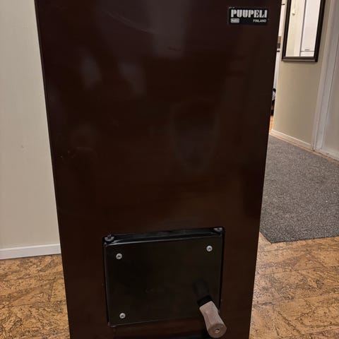 Kuvan mukainen ilmeisesti entinen koksille ja pelletille soveltuva varaava lämmitys uuni/kamina.