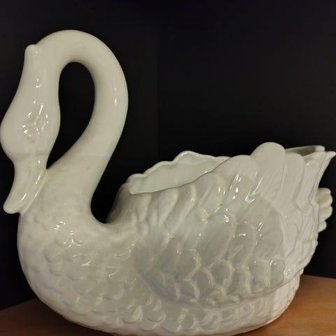 Kaksi kaunista ja hyväkuntoista posliinista Joutsen ruukkua /koriste- esinettä.Näihin voi istuttaa vaikka kukkia .Isompi 21cm korkea ,30cm leveä hinta 15 euroa.pienempi 16cm korkea ,13cm leveä hinta10 euroa.yhteishinta 20euroa..
