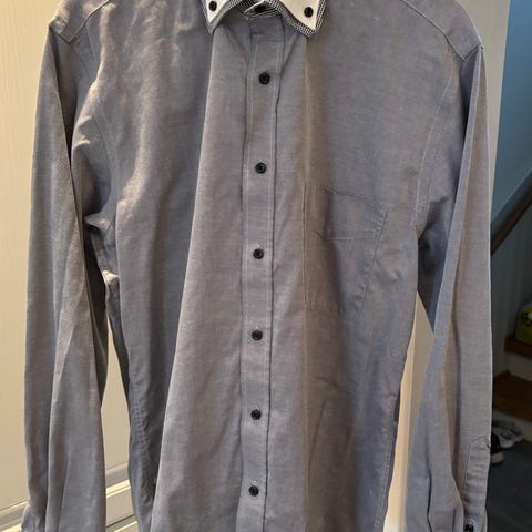 Puna raidallinen Kauluspaita, koko C/43-44, edessä-ja hihan suissa napit, povitasku, materiaali 40%polyesteria, 60%puuvillaa, mitta kainalosta kainaloon 68cm edestä mitta, hihan mitta kainalosta hihan suuhun 55cm, mitta olalta helmaan 79cm, siisti