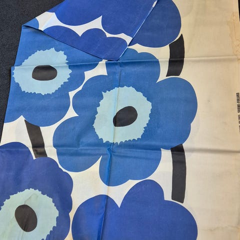 Jonkun ompelema unikko-kuosin pieni pöytäliina. Mitat 63 x 65 cm. Uudenveroinen, ei tahroja ja värit kirkkaat. Siisti ompelujälki. Vaatii silittämisen. Kankaan voi hyödyntää myös ompeluun.