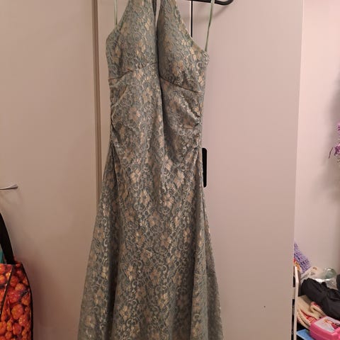 Kevyt ja kesäinen kotelomekko. Alusmekko raikkaan vihreä, päällä valkoinen pitsi. Kokolapussa L, mutta vastaa enemmän M-pieni L.