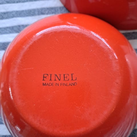 Finelin purkkeja. 2 ruskeaa ja yksi punainen. Korkeus ~11,7cm & halkaisija ~10,5cm.