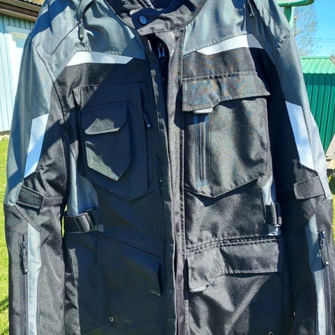 MP Ajotakki koko XL,muita mittoja leveys kainalon alta 65cm jolloin ympärys 130,helman ympärys 110,molemmissa sivuissa 18cm jousto-osat.Hihat on vetoketjulla irrotettavat,hihan pituus olalta n.67cm,takin pituus takaa 69cm.Siisti,vähän käytetty takki,vain hopeanvärisissä tereissä takana pientä kulumaa.