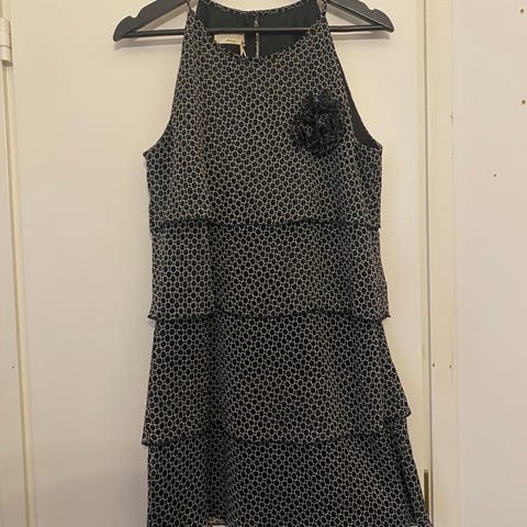 Myydään musta-ruskea-raidallinen puku. Merkki on Apanage. Materiaali on 63 % polyeste- riä . 32 % viskoosia ja 5 % elastaania.