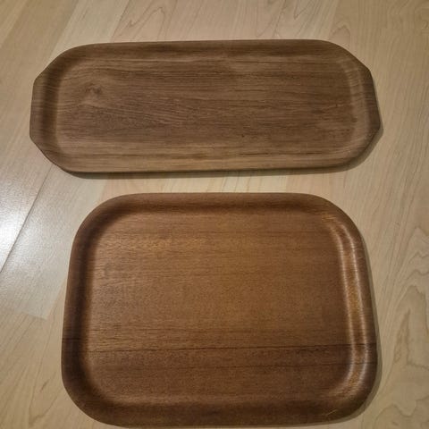 Kuvan upeasti muotoiltu kokopuinen Teak puuta oleva tarjotin. Pituus 44cm, leveys 15cm. Kauniit muotoillut kahvaosat päissä. Kaunis -70 luvun Design. Tarjotin soveltuu kauniisti Alvar Aalto tuikku maljoille, kirkas lasi. Hp kokonaisuus tarjotin ja Aalto pienet tuikkukipot yht. 55e
