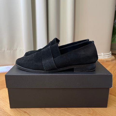 Terhi Pölkki mustat teräväkärkiset loaferit/sandaalit/avokkaat hapsuilla.