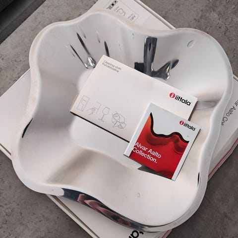 Timo Sarpaneva suunnittelema vati. Laatikossa oleva iso teräsvati pakkauksessaan, uusi. Halkaisija vadilla yli 40cm. Tästä hyvä ja laadukas lahja läheisellesi. Käyttötarkoituksia useita esim. Sisustukseen, Kynttilöille, hedelmille, makeiset, keksit ym. Arvo vadilla kaupassa 4-6 kertaa enemmän, mikäli on enään myynnissä. Tinkimisvaraa ei ole, hintaa alennettu paljon.