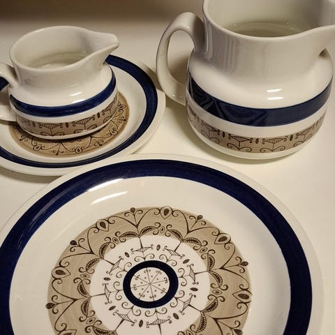 Mustia Luminarc Octavia lautasia ja kahvikuppeja ja valkoisia lautasia