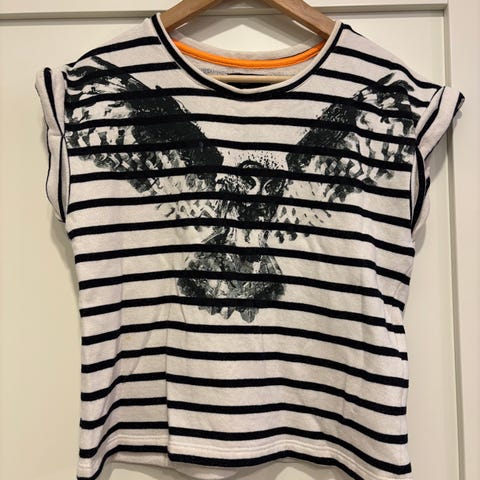 Valkoinen t-paita printillä. Koko M, katso mitat. Käytetty vain kerran ja pesty, eli ehjä ja siisti. Pesulappu leikattu pois, kun näkyi kankaasta läpi, mutta 100% puuvillaa. Ostettu Zalandolta, 19,95,-.