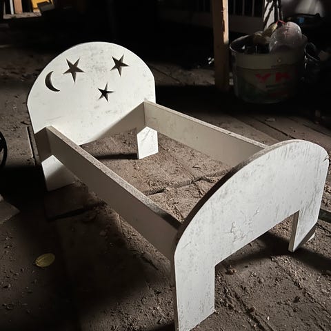 Vaarin itse puusta tekemä valkoinen nukensänky. Pituus 57 cm, leveys 26 cm ja korkeus 29 cm.