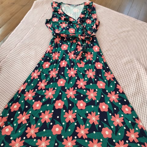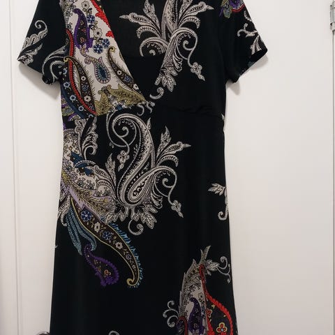 Kerran päällä ollut mekko, hyvin laskeutuvaa viskoosia, ei rypisty. Musta pohjaväri, valkoiset kukat, joissa myös keltaista.