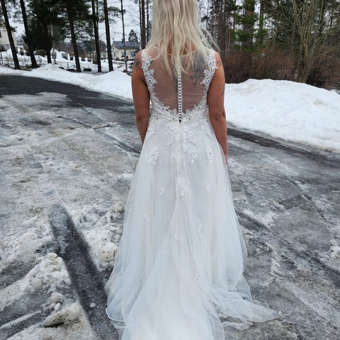 Kaunis päivän verran käytetty hääpuku, pesettämätön (huomioitu hinnassa). Ei vaurioita, eikä tahroja. Mekkoa säilytetty pukupussissa, mutta taloudessa koiria, joten karvoja saattanut tarttua.