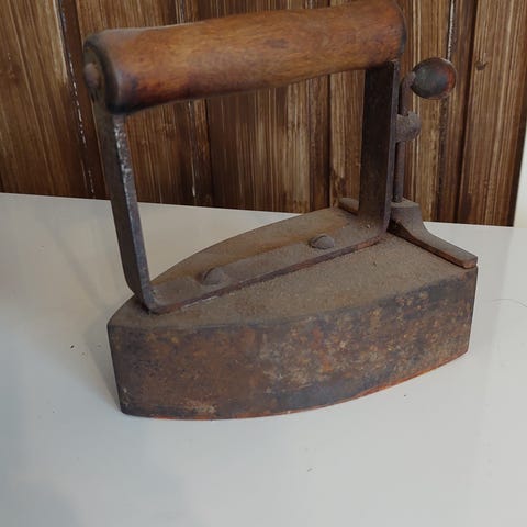 Elämää nähnyt antiikkinen silitysrauta sisustukseen .. puinen kahva.. lukee mainos Porin konepaja.. painaa. Nouto..