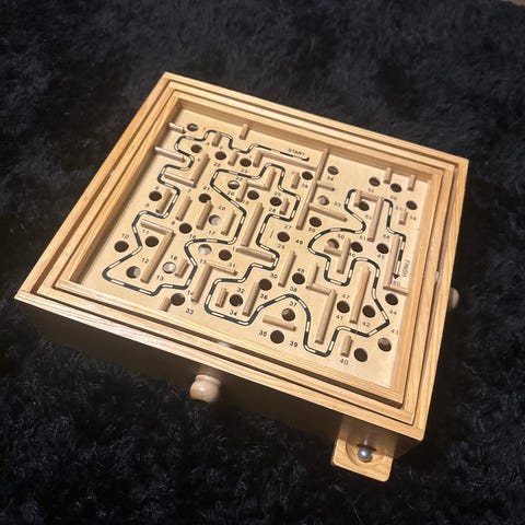 Kuvan käytetty ja ehyt labyrintti, kaksi kuulaa mukana. Puurunkoinen. Koko noin 33 x 29 x 8,5 cm.
