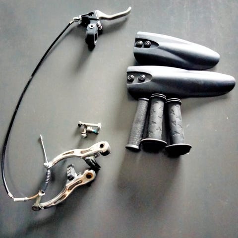 Muovinen pedaalipari, jossa merkinnät K1029 ja SP808, muoviosa 9,5cm pitkä, leveys 6,5-7,5cm. Toisessa keskitanko vähän vääntynyt