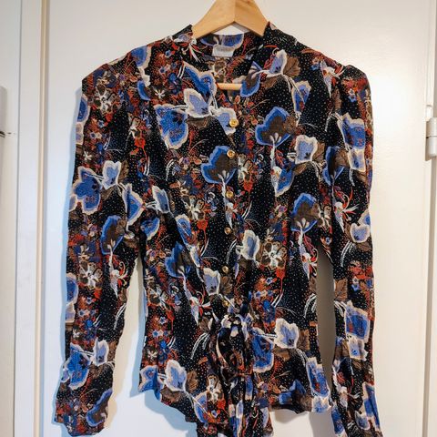 Aniliininpunainen kukkakuvioinen lyhyt vintage kauluspaita. Kangas hieman joustavaa viskoosia. Hauska napitus edessä. Takana yksityiskohtana rypytys. Tehty Suomessa. Kokomerkintä 34.