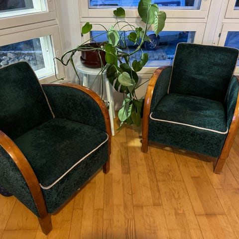 Hillevi Sepposen design jalopuiset nojatuolit 2 kpl, kotimaista laatutyötä. Lisäksi tuoleja saatavana 5 kpl eril. verhoiluilla.