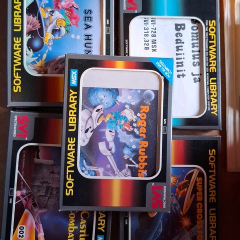 spectravideo, MSX tietokoneen oheislaitteita ja moduuli ja kasetti pelejä.