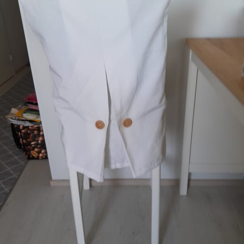 Myydään 2 kpl uusia tuolin irtopäällisiä. Olivat väärää kokoa omaan tarpeeseen. Selkäosan mitat ovat leveys 45cm ja korkeus 53cm. Istuinosan mitat leveys 45cm ja syvyys 36cm. Kokonaiskorkeus on 75cm. (HUOM! Valokuvan tuoliin päällisen ei ole tarkoituskaan olla sopiva. On vain malliksi ripustettu johonkin.) Väri on vanilja. Takana on kaunis rusetti. 4€/kpl.