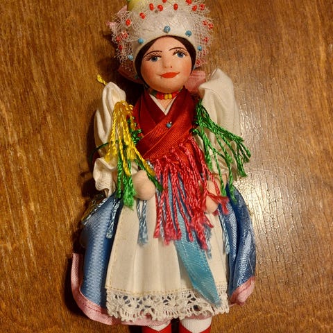 Korkeus komean päähineen kanssa on n. 18 cm. Nukkea on säilytetty koko ajan muovirasiassa, ei ole pölyttynyt eikä haalistunut. Muovirasia on mennyt keltaiseksi.