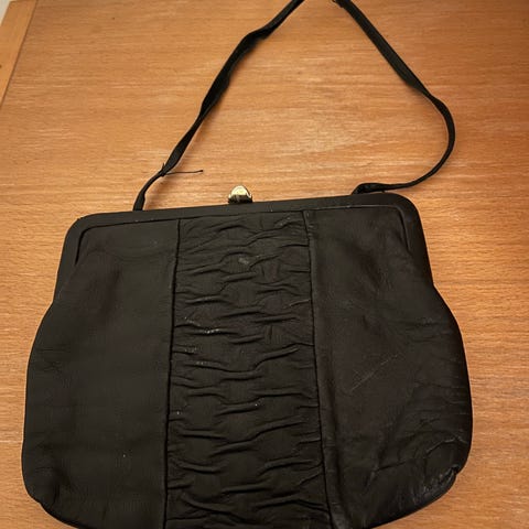 Uniikki, vuorillinen pikkulaukku 40-luvulta, rypytettyä nahkaa. Hj. Jousi Oy. Korkeus 19cm, yläosan leveys 16cm, alaosan 20cm. Hyvä kunto, siisti myös sisältä. Kauhajoki.