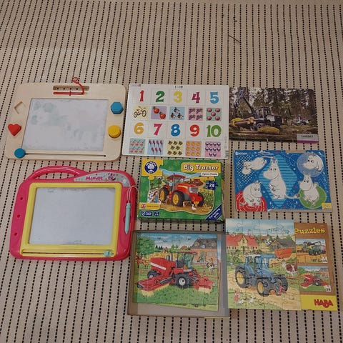 Kaksi palapeliä ja logiikkapeli, jossa pitää saada eläimille oikeat päät.