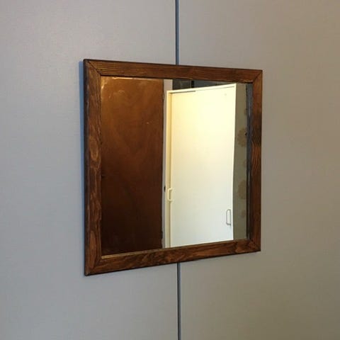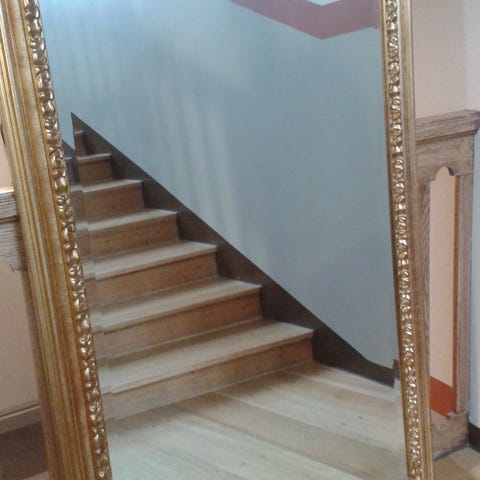 Jugend tyylinen painava peili, jossa on koristeellinen kehys ja ruskea viimeistely. Mitat 70 x 80 cm. Materiaali on muovi, ja sen väri on lämmin ruskea. Itse peili on virheetön.