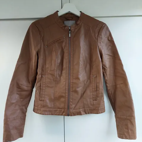 Uusi, käyttämättä jäänyt, tekonahkainen takki. Helposti vetoketjulla irroitettava kollegehuppu (viimeisessä kuvassa takki ilman huppua).
