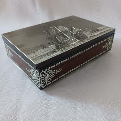 Tämä pieni, napakasti kiinnipysyvä peltirasia saattaa olla uustuotantoa. Sen mitat ovat: sivun pituus vajaa 6cm; syvyys, leveys 4cm; korkeus 2,5cm. Pohjois-saksalainen laivayhtiö NDL, Norddeutscher Lloyd on perustettu Bremenissä v 1857 ja se toimi vuoteen 1970. Rasian alaosassa näkyy ylellistenkin laivareittien kohteita. Tarvitko sen kokoelmiisi vaiko pillerirasiaksi? Muitakin vastaavia on myynnissäni. Kurkkaahan monenlaisia Tori-tuotteitani (mm. vintagea, keräilytavaraa, nukkeja, figuureita, merkkejä, astioita, jalkineita, vaatteita, metallitavaraa), saatat jotain hankittavaa vaikka löytää. Laita tilausviestiä. Samassa lähetyksessä useampi tuote kohtuullistaa postikulujasi.