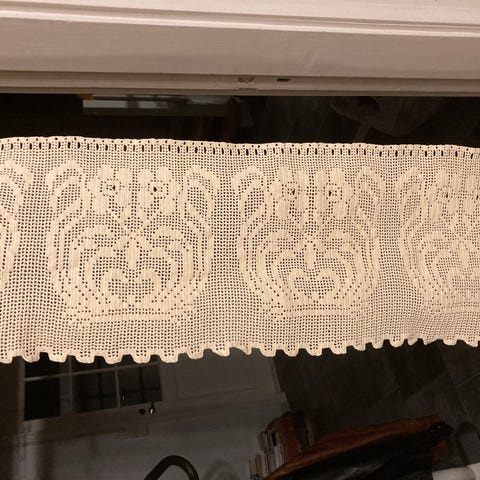 Kalalangasta virkattu peite / pöytäliina tms. 145 x 190 cm koko ilman hapsuja, hapsut joka sivulla. Koiratalous. Kulkeutuu myös Turku, Kaarina, Raisio.