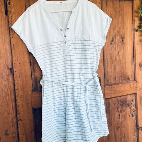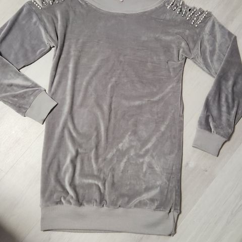 Mukava Anttila lyh.hih. tunika. Reilu S koko. Tumman violetti, jossa edustassa kuvio. Toisessa helmassa halkio ja solmimisnauha. Pituus 80 cm. K-k 110 cm. 100 % pv. Pm 7,90e.